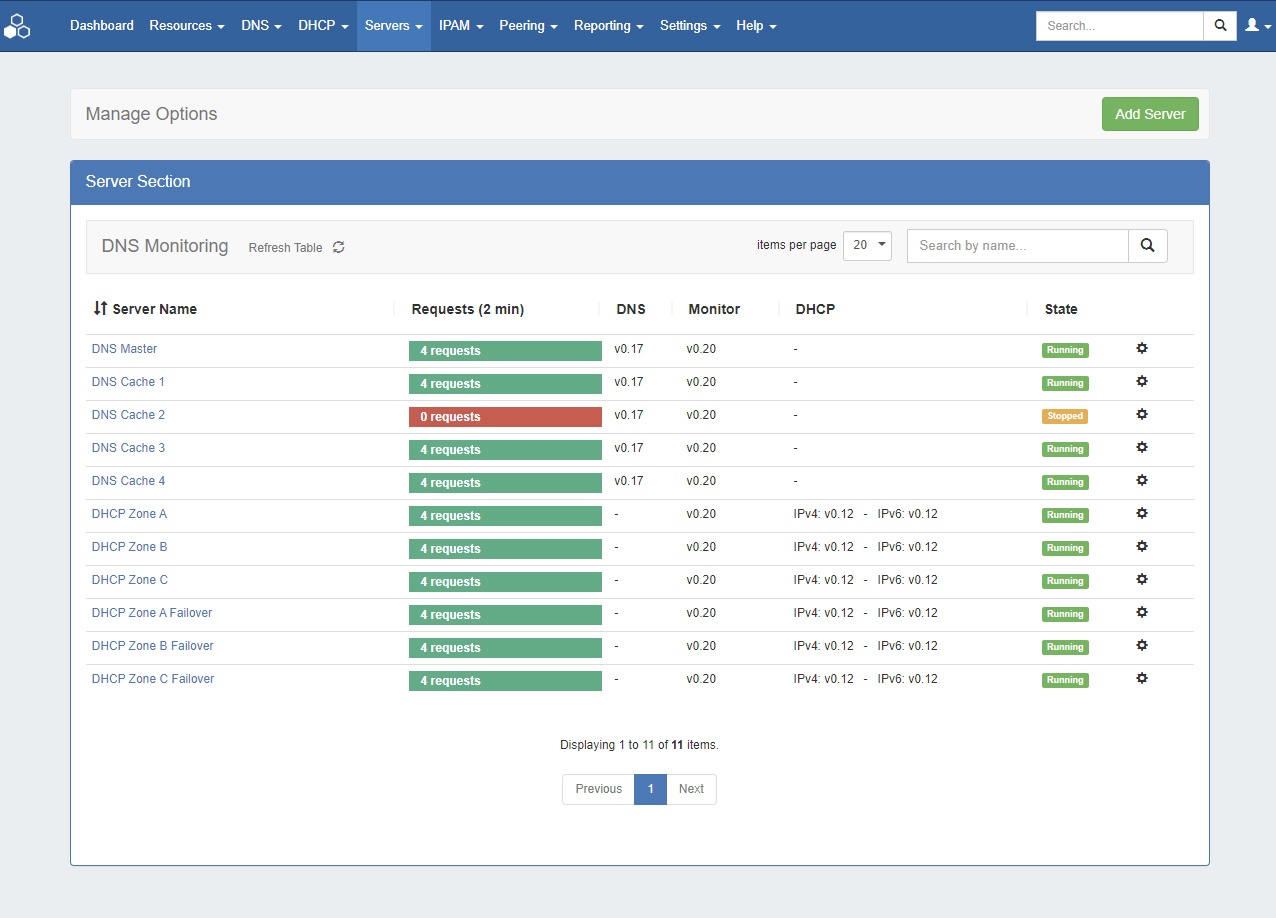 ProVision's Managed Servers tab allows for DNS (Knot-based) and DHCP(Kea-based) VMs to be created, managed and monitored from within ProVision, either from the GUI or command line.
