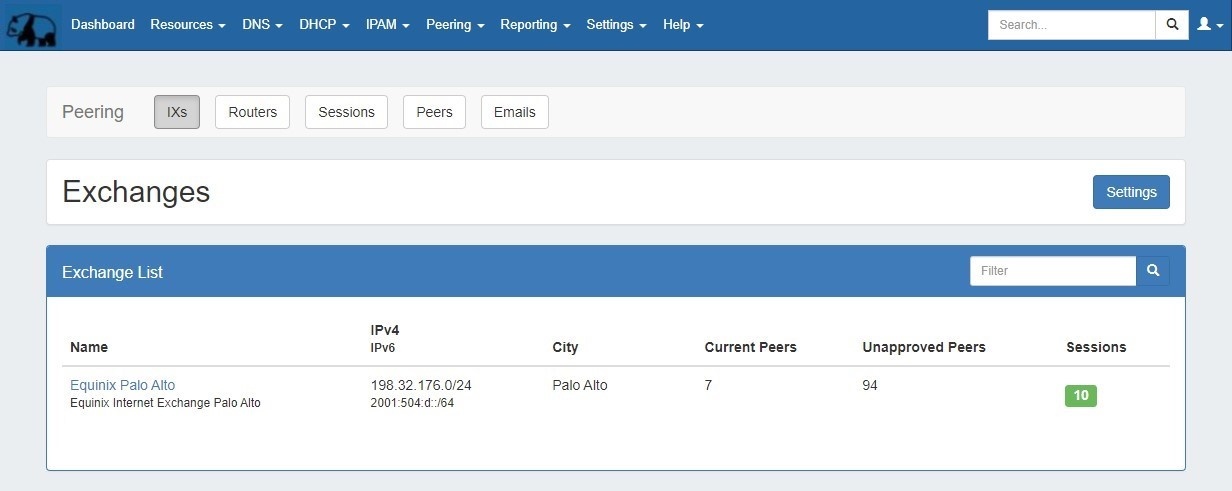 The IXs tab shows the exchange list. From here, you can edit exchange settings and view, manage, and mark peer status and communications via the exchange details page.