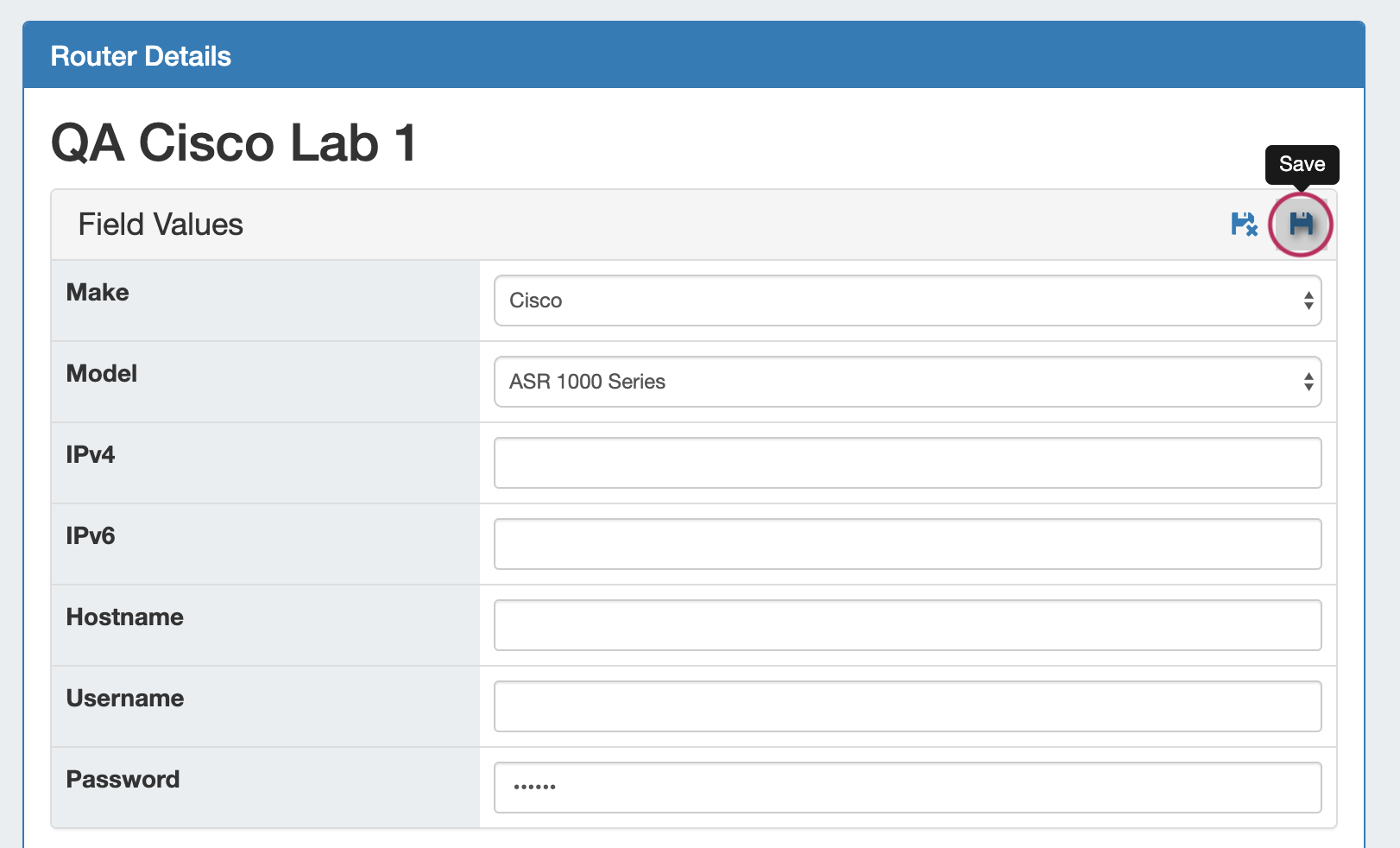 Enter in router details: Name, Make, Model, Hostname, IP address(es), and credentials. If desired, you can confirm the connection by clicking "Test Connection".