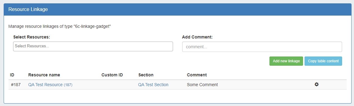 To use the Resource Linkage Gadget, first, ensure that "Resource Linkage" is enabled under "Manage Gadgets" for the section type of the resource being used.