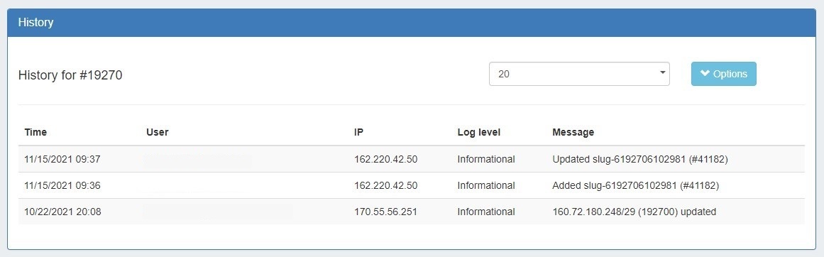 Log activity can be filtered by clicking "Options". Logs may be filtered by log level, user, user group, and date. Filters can be saved as the default gadget view by clicking "Save".