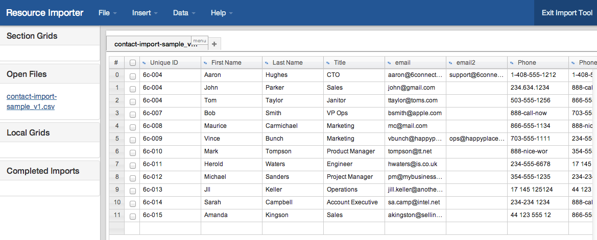 In order to illustrate the abilities of the Resource Importer to edit data and adjust for formatting issues, the Contact Import Sample .csv is used intentionally leaving a few less-than-ideal conditions (much like you may encounter in real life) such as leaving typos, having an extra data column, and missing a needed column. If you follow the "Before you Begin" requirements and "Best Practice" notes, however, you may be able to skip any editing or column adjustment steps.