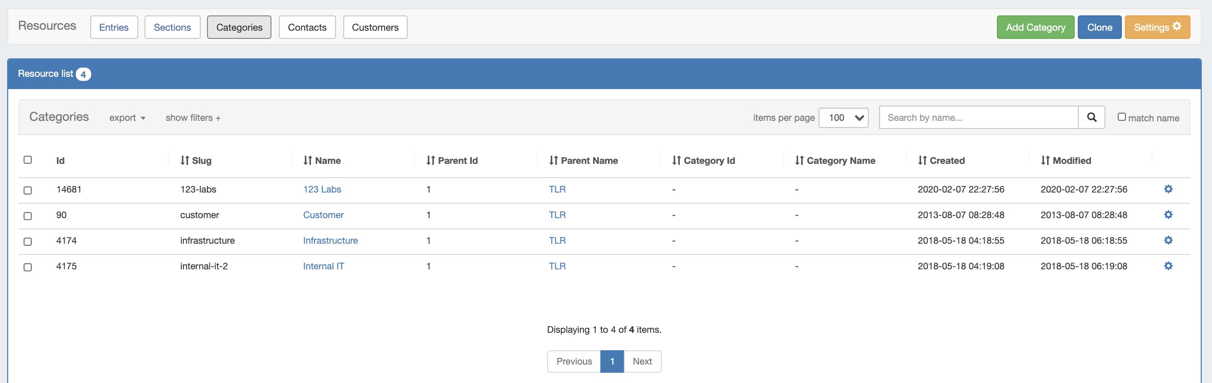 Categories can be used to create some filtered views for given resources and sections. For example, you can create a section called "Resource Holder" and then assign a category "Customer". Then you can view a list of resources that have been assigned to category "Customer". In the same way, you could also assign a section called "Router" under the parent resource "Corporate Datacenter" and then assign a category "Infrastructure".