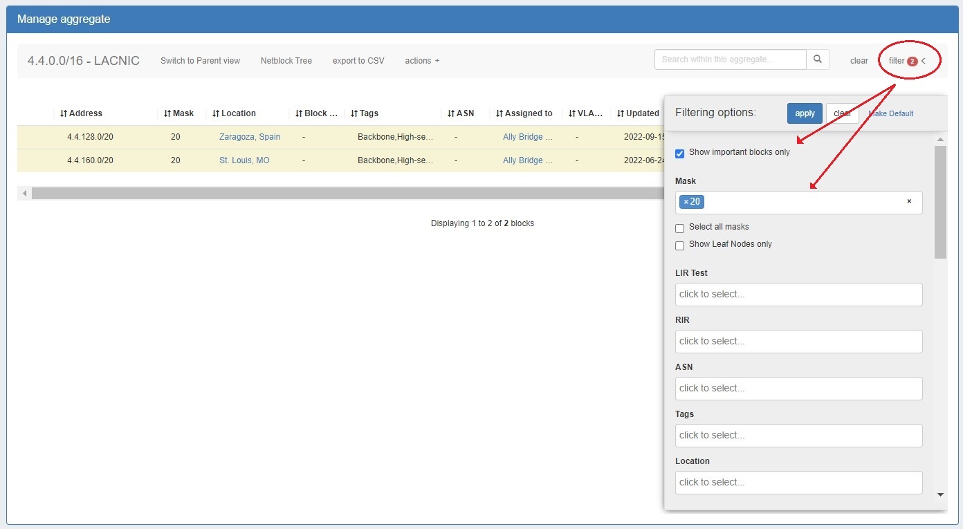 Filter the block list in IPAM Manage by toggling the "Filter +" link in the top right corner of the aggregate header.