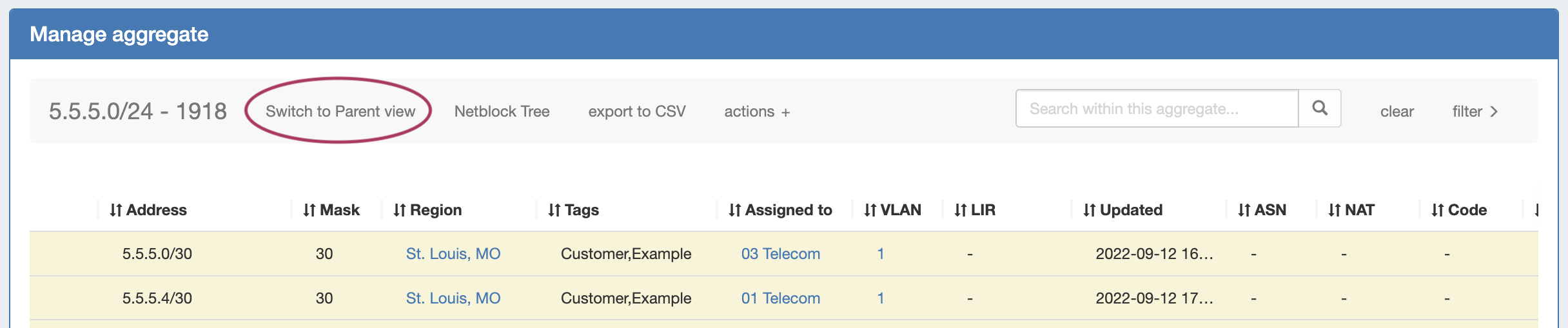 While in Manage aggregate, view parent blocks / IP block hierarchy, click on "Switch to Parent View" at the top of the block list.