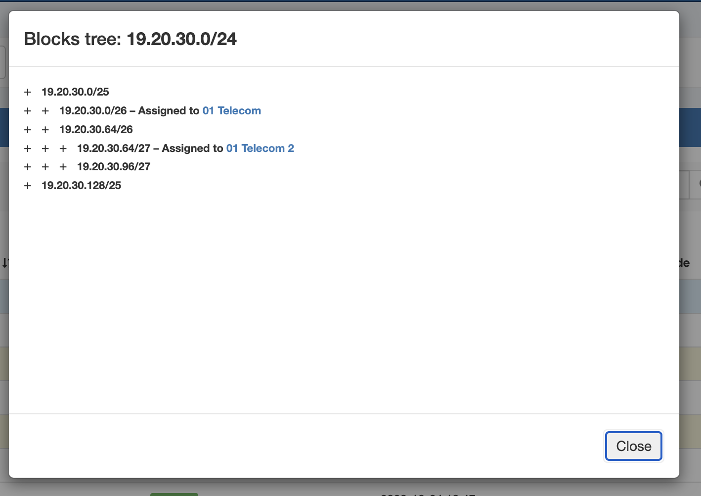 - If no more changes in assignment are detected down the block tree, the lowest branch will display as containing individual addresses (/32s or /128s). The addresses may be both theoretical and those existing in ProVision.