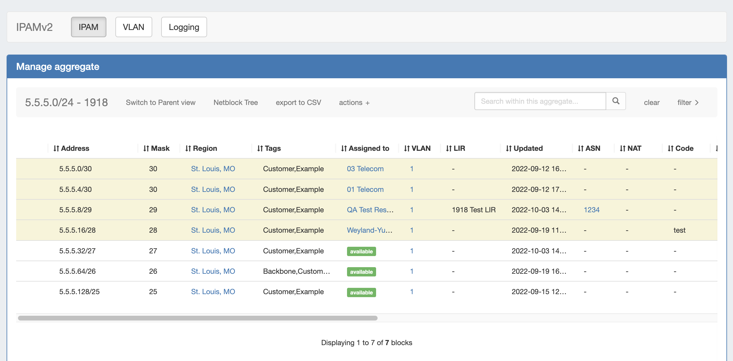 This will open IPAM Manage for all blocks in ProVision, with all the same filters, block edit functions, and search capabilities as in 'standard' IPAM Manage for an aggregate, but with no aggregate-level actions available.