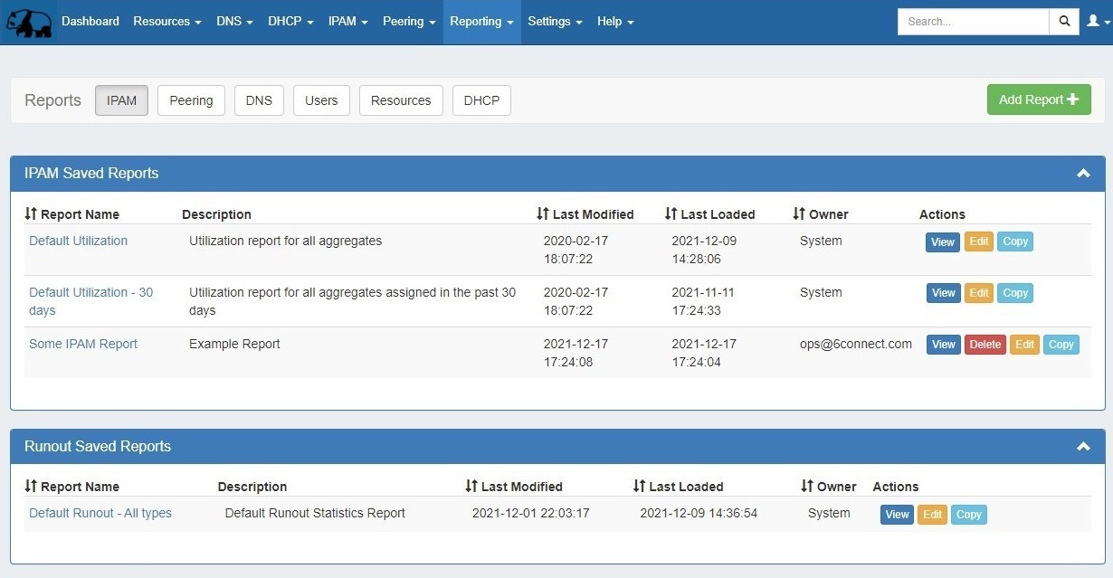 Reporting v2, accessible to admin users from the Reporting tab, contains reports for six ProVision modules - IPAM, Peering, DNS, Users, Resources, and DHCP. Default reports are available for each module sub-tab, and users may create their own customized report from the existing templates. Once created, reports may be exported on-demand, or have exports scheduled to be sent to a user at regular intervals.