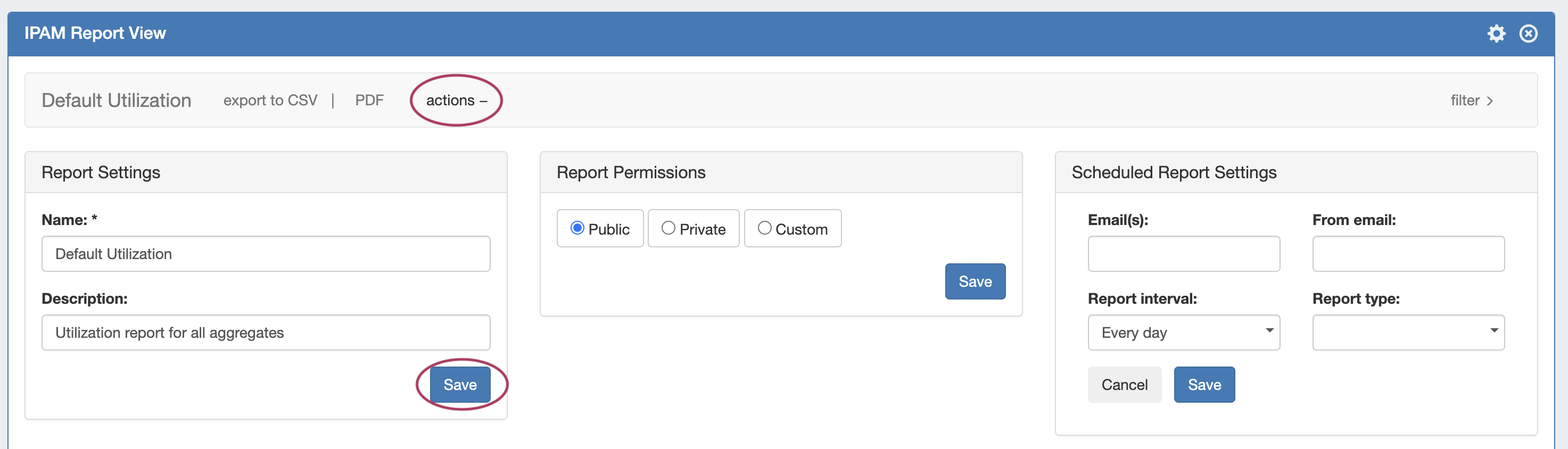 To edit Scheduled Report Settings, update or enter the desired field. Under "Email(s)", multiple email addresses may be comma, semicolon, or space separated. When done, click Save. To close the actions panel, click Actions .
