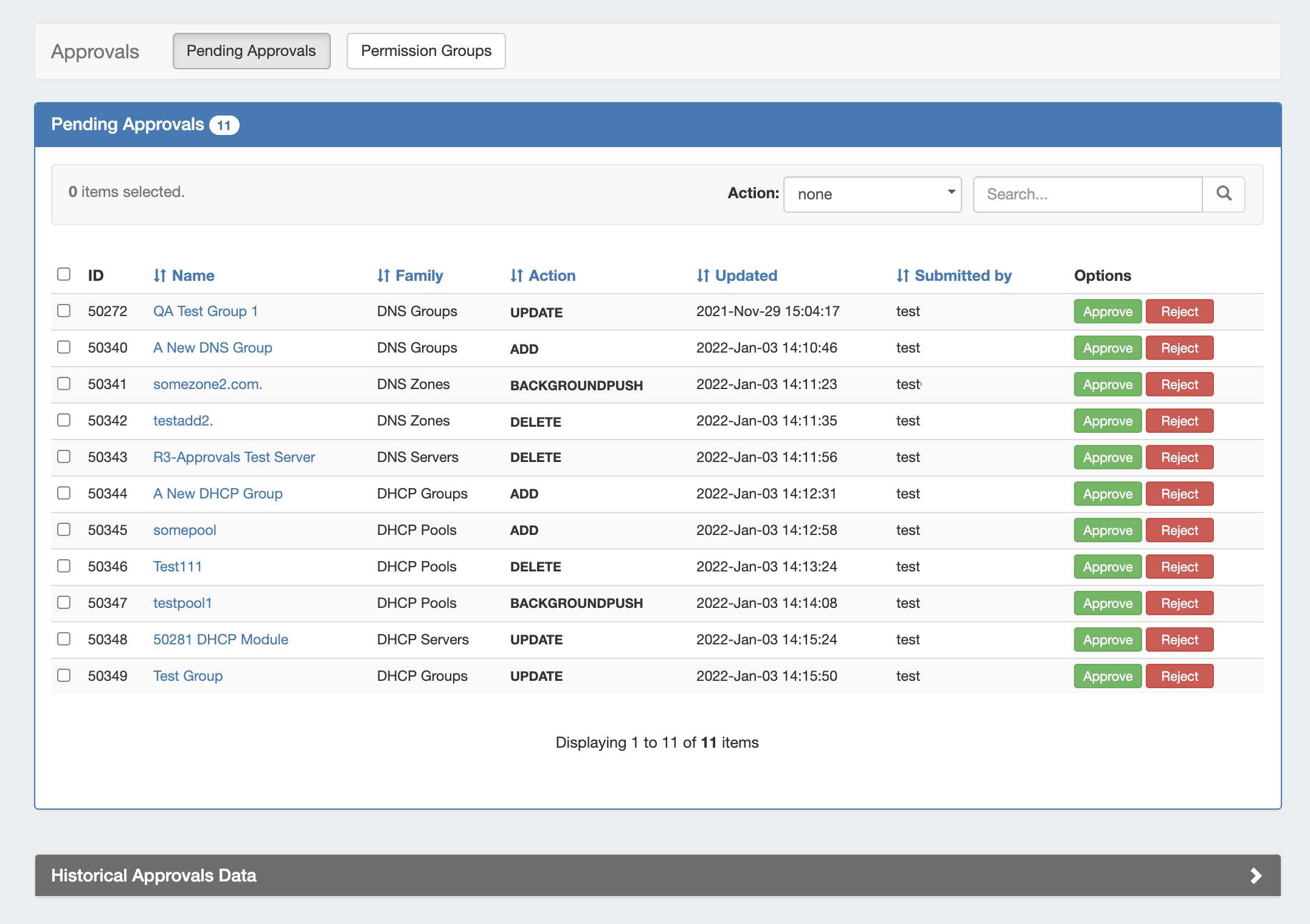 The Approvals module stores and queues DNS and DHCP actions made by selected User Groups, and sends those actions to a Pending Changes list for administrative review.  Later, an administrator (or combination of administrators) can approve or reject these stored actions.