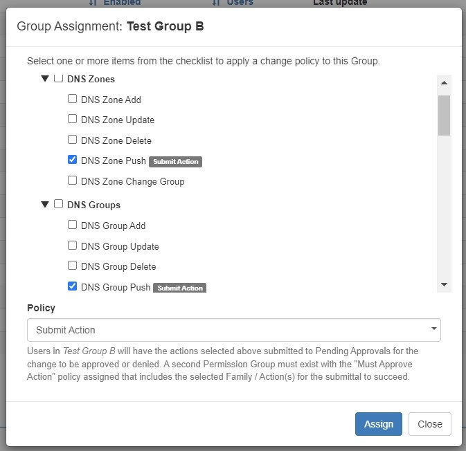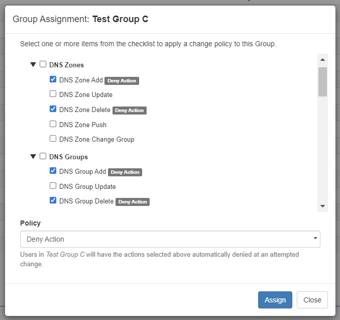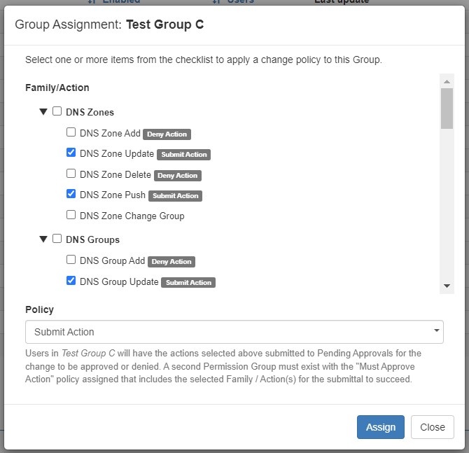 Clicking the "Assign" button for a group brings up a checklist to select what policy to apply to the group for what Family and Actions (i.e. DNS Zone 'Add' or DNS Group 'Update'). Select either "Deny Action", "Submit Action", or "Approve Action" under Policy. Once you've selected a policy, you can "quick-select" all actions for a DNS Family (Severs, Groups, Zones, Records) by clicking the checkbox next to the family name, or only select individual action types for each Family.