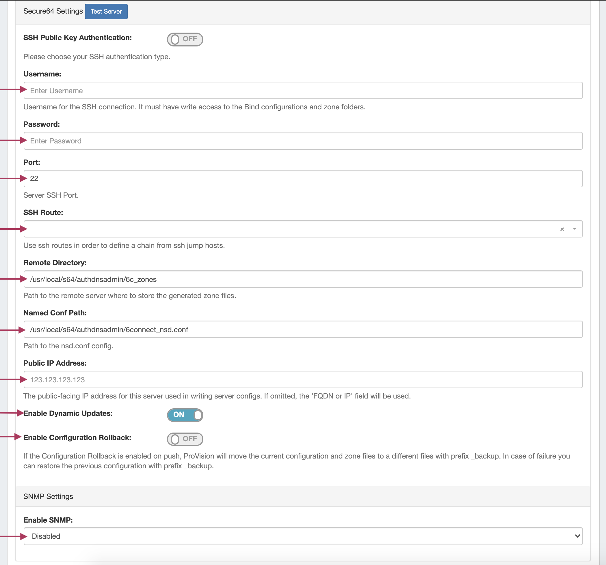 Enter the server Username, Password, Port, Remote Directory, Named Conf. Path, and whether to enabled SNMP.