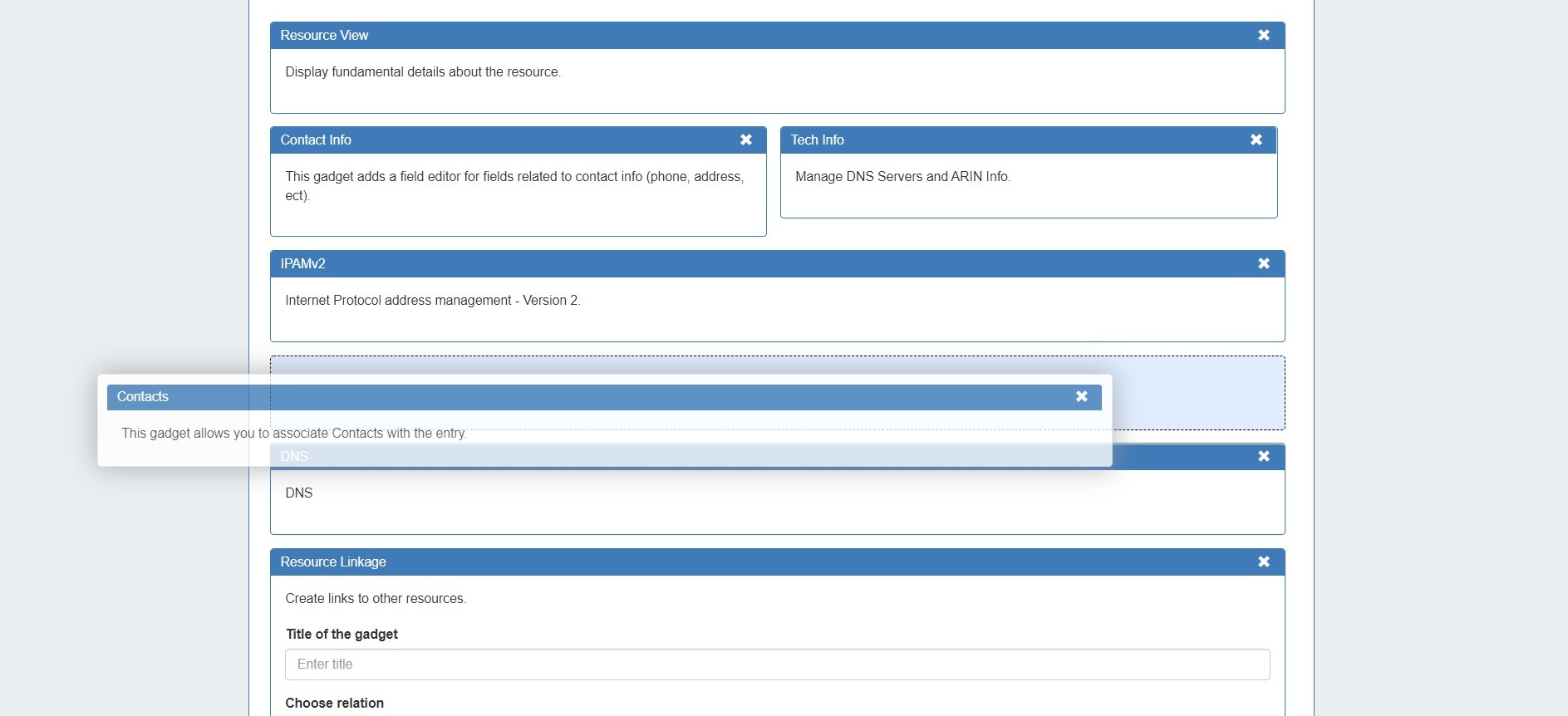 (8.2.0-8.2.1) Gadgets are modules of additional functionality that can be added to the UI of a given resource. From the Manage Gadgets tab, simply select the gadget you want to show for that section and hit "Add Gadget".