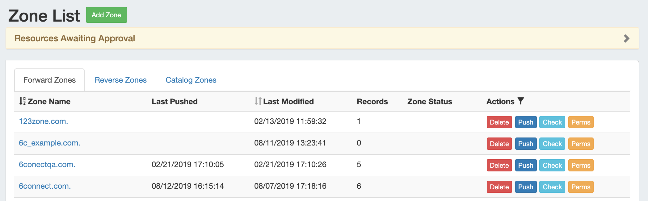 DNS Zones are accessed under the DNS tab, DNS Groups or DNS Zones sub-tabs. The DNS Zones sub-tab features the DNS Zone List - a straightforward list of all zones existing in ProVision, including those not attached to DNS Groups. From here, you can create a new zone, view all Forward, Reverse, and Catalog zones, delete, push, check, view pending approvals, or edit permissions (admin only) on a zone.
