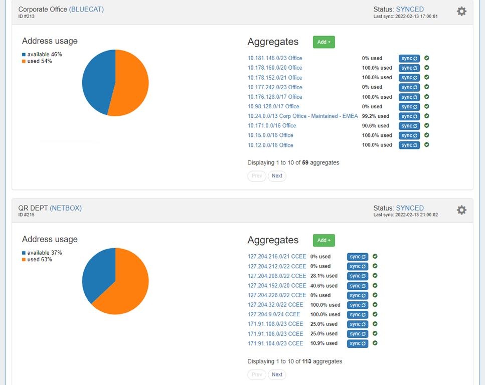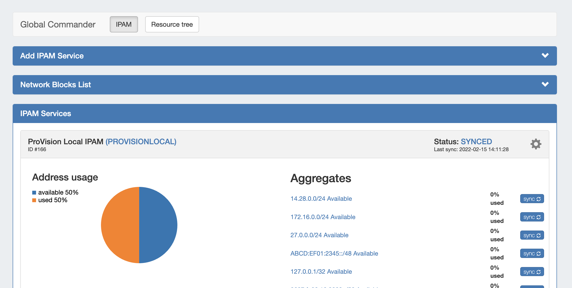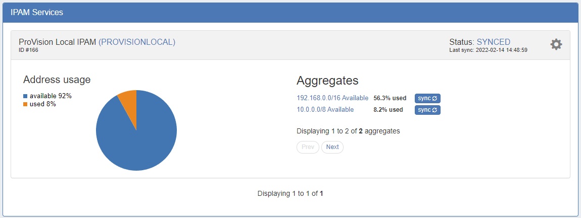 Notice the "Status:" area has changed to "SYNCED", alongside a date of the last Sync. The service card now shows the Aggregates available in the IPAM system. For convenience we also offer the ability to sync individual aggregates on demand.
