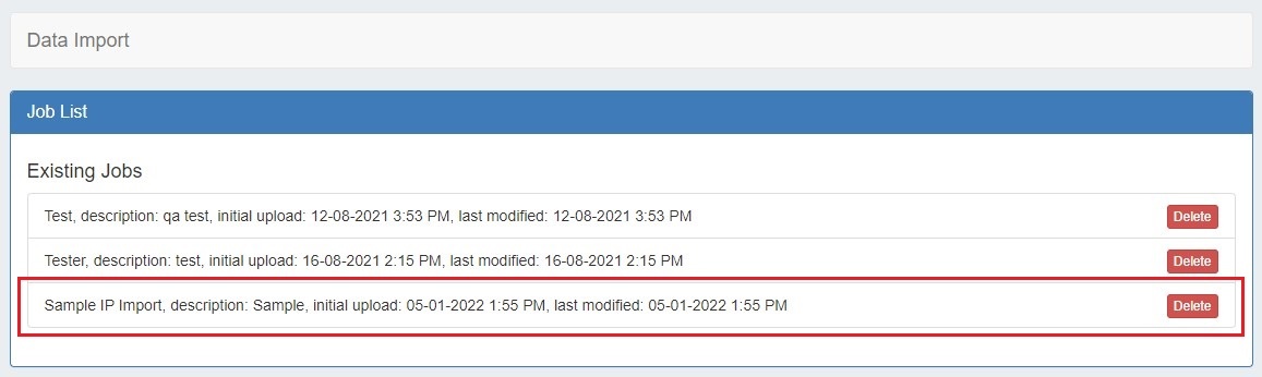 If the IP Import was fully successful, and you do not wish to retain the job data, the Import Job may be deleted from the "Existing Jobs" list by clicking the delete button next to the job name.