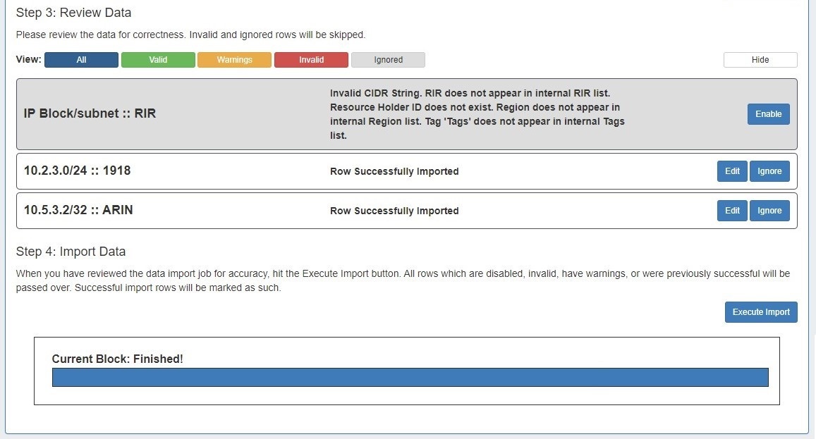 • If the IP Import was only partially successful or requires additional review, you may keep the import job in the "Existing Jobs" list and revise the failed / invalid blocks at a later time. Re-running the import from the same job will allow you to re-attempt import on only the previously unsuccessful / ignored / edited blocks - successfully imported and unchanged blocks will not be affected.