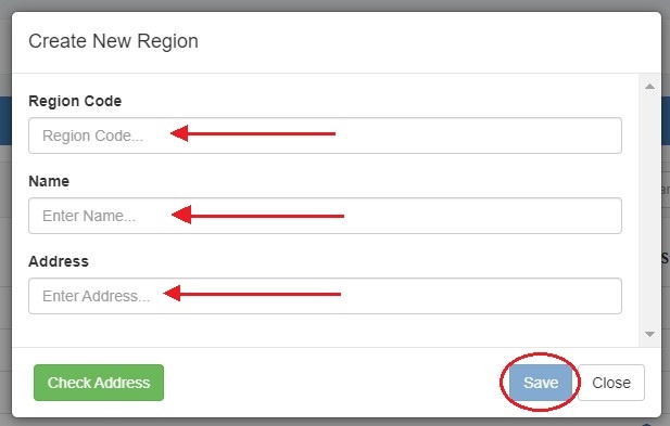 In the form that appears, type in a new Region Code, Name, and Address into the empty fields and click "Save".