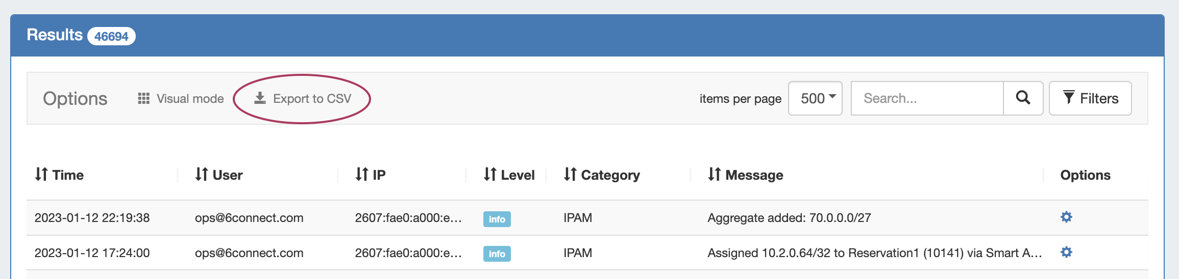 You may also change the number of log entries per page by selecting an option next to "Items per page" at the top right of the results list. By default, this value is set to 100.