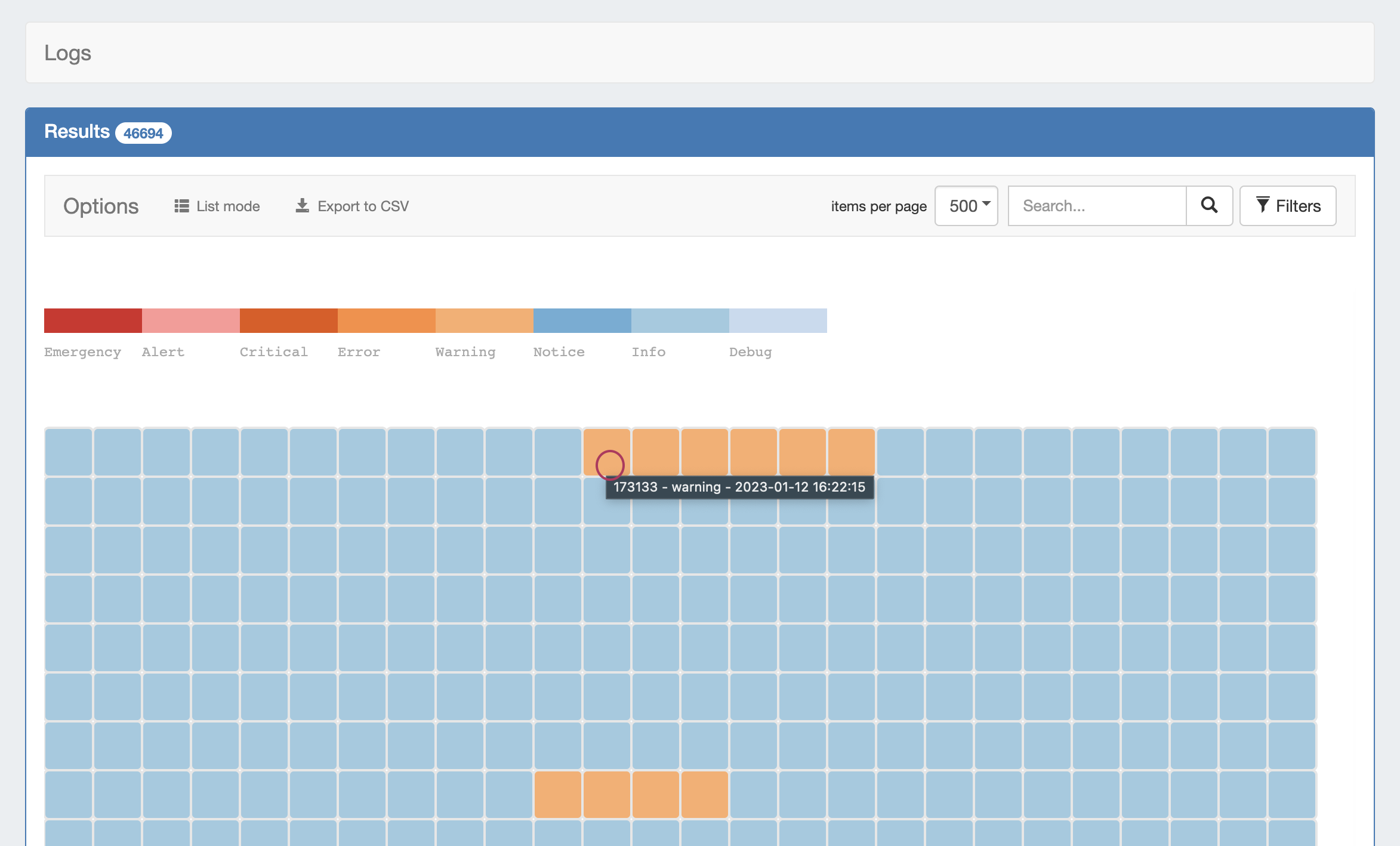 • Level: Available Level filters include:  "All Levels", "Emergency", "Alert", "Critical", "Error", "Warning", "Notice", "Info", or "Debug".