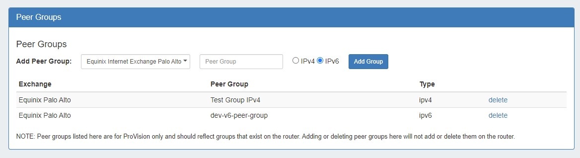 To do this, simply select the exchange, type in a peer group name in the text box, select IPv4 or IPv6, the click "Add Group".