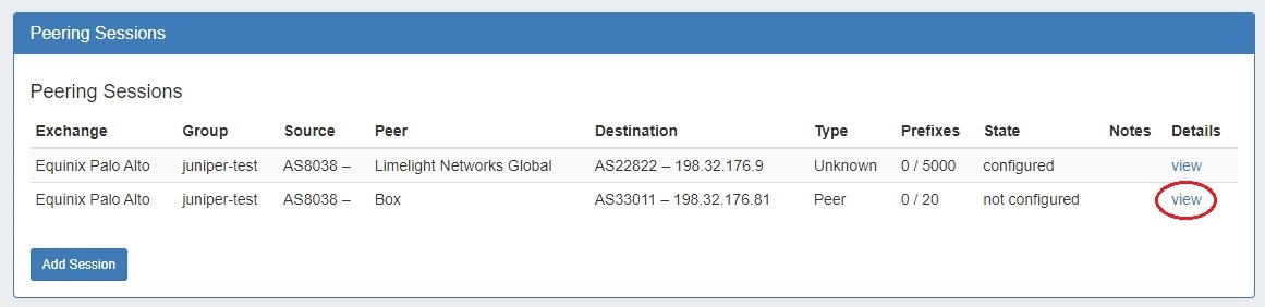 Existing sessions may be managed by clicking on the "View" link for the session, bringing up the peering session details page.
