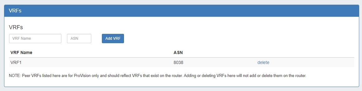 To add a VRF, type the VRF name and ASN, then hit "Add VRF".