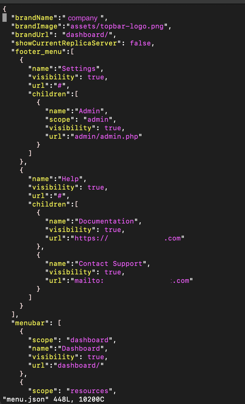 The top level of menu.json contains instance-wide settings for: