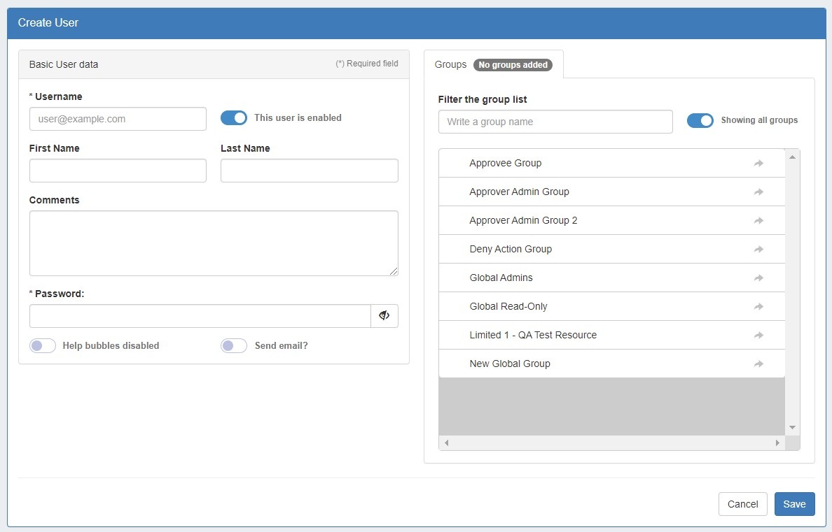 You may enter or edit the Username, First Name, Last Name, whether to enable help bubbles, and select one or more permissions groups to which to assign the user.