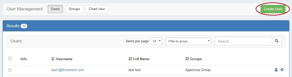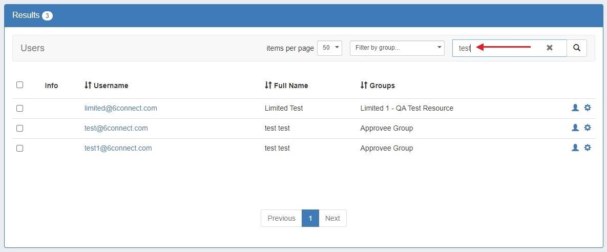 Select the "items per page" filter to limit the number of users displayed at one time. Any additional users will be displayed on following pages.