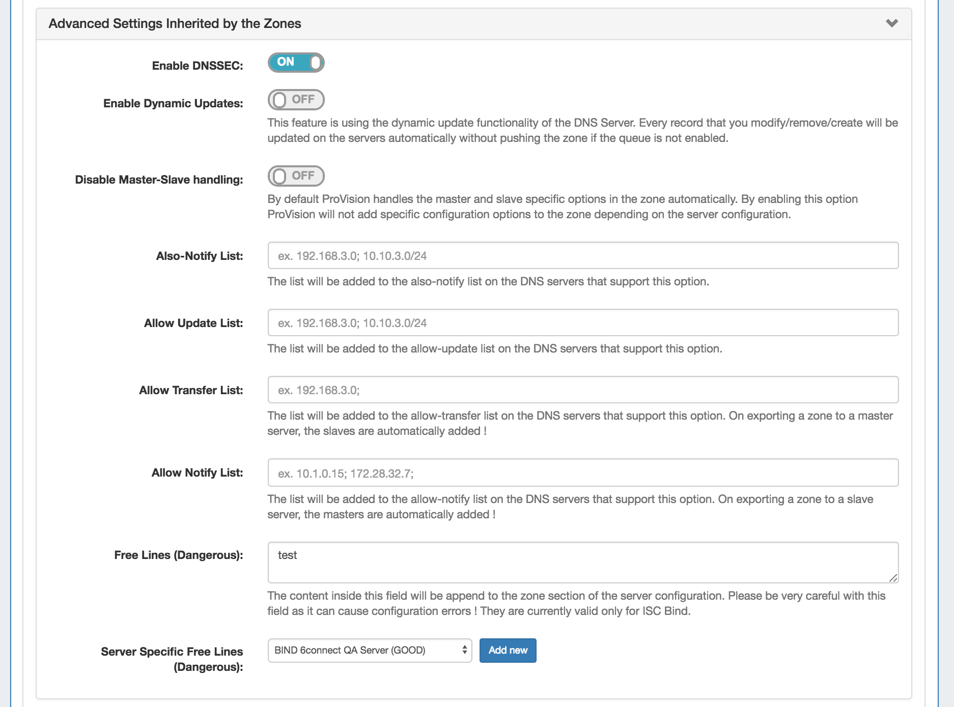 DNS groups allow for organizing multiple zones together and linking those zones with one or more servers. Default nameservers, SOA values, and ACL's are set at the group level, so different groups may have their own default values. Zones may be pushed individually, as a group, or at the server level.