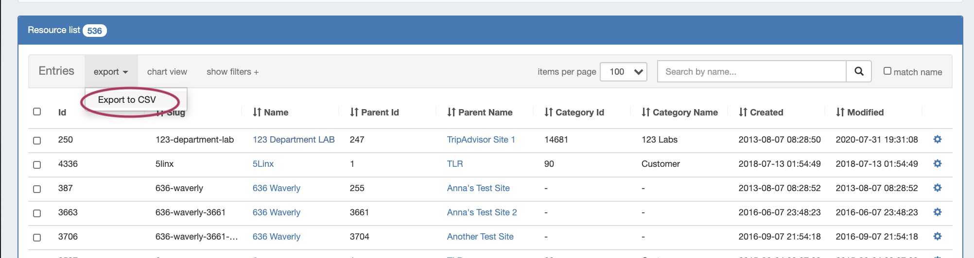 To export all resources/ resource fields displayed in a Resource List, select "Export to CSV" from the top header for the desired resource list.