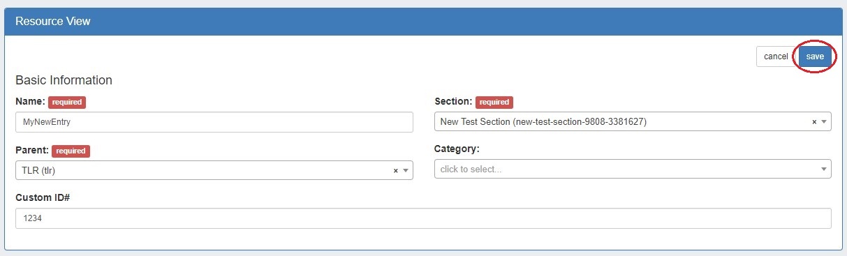 Fill in the Name of your new resource entry, select a section (the chosen section determines what gadgets will show on your new resource's entry page), the parent resource, category, and enter a Custom ID number if desired.