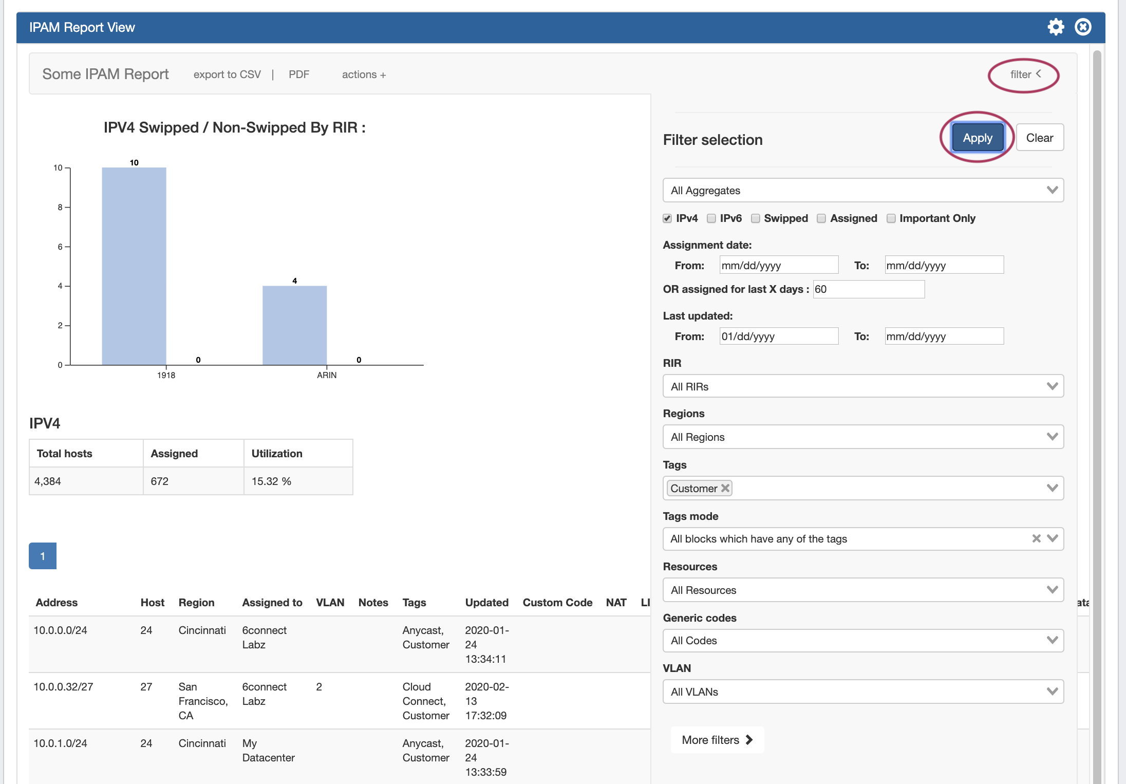 - IPAM Utilizations report - displays IPv4/IPv6 Swipped and Non-Swipped by RIR bar charts, with host utilization tables