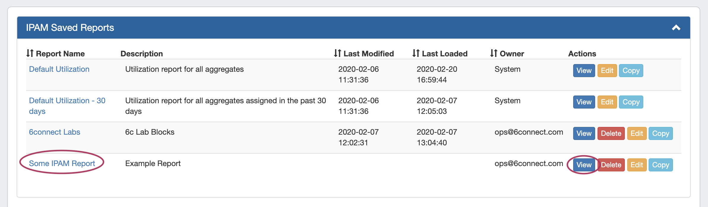 Open a report view by clicking on the report name in the Saved Reports list, or click "View" under report Actions.