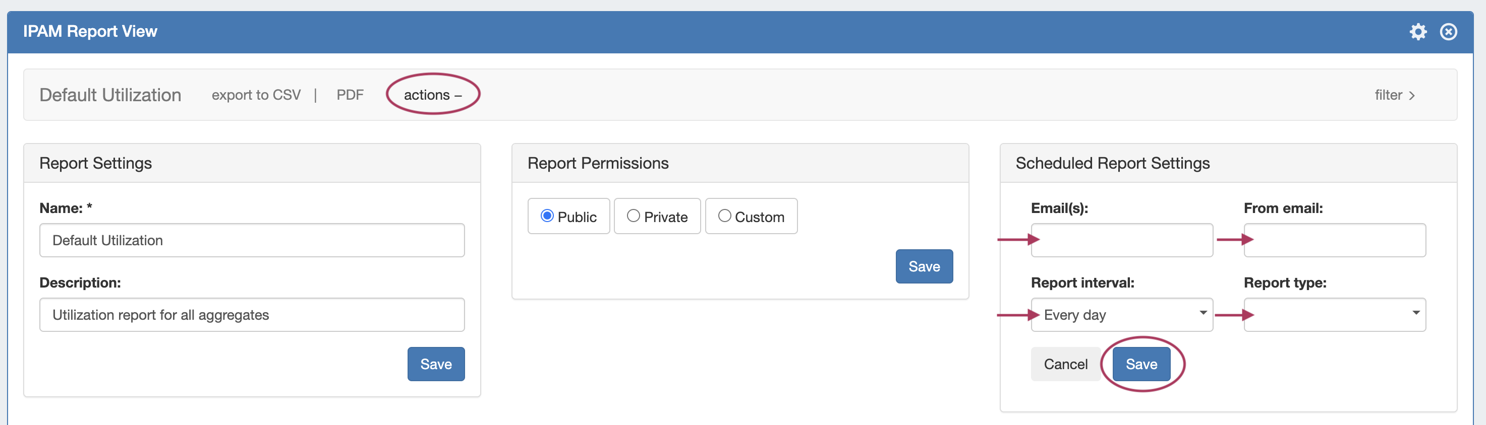 To edit Scheduled Report Settings, update or enter the desired field. Under "Email(s)", multiple email addresses may be comma, semicolon, or space separated. When done, click Save. To close the actions panel, click Actions .