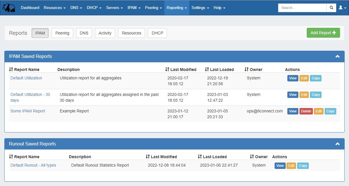 Reporting v2, accessible to admin users from the Reporting tab, contains reports for six ProVision modules - IPAM, Peering, DNS, Activity, Resources, and DHCP. Default reports are available for each module sub-tab, and users may create their own customized report from the existing templates. Once created, reports may be exported on-demand, or have exports scheduled to be sent to a user at regular intervals.
