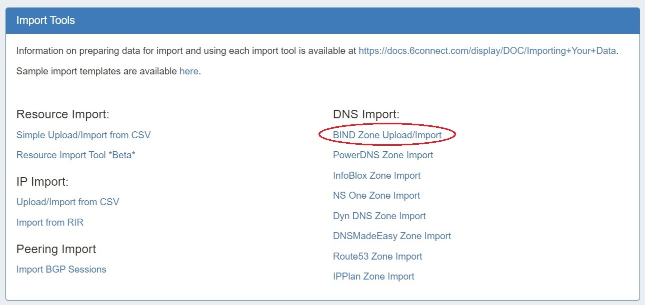 Navigate to the Data Import Tab from the Admin button to import your data. Select "BIND Zone Upload/Import" under "DNS Import".