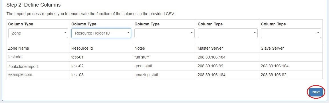 For DNS imports, two column definitions are available: Zone and Resource Holder ID. Using the dropdown menu, select the appropriate column for the zone name and Resource Holder (customer) associated with zone. The Resource Holder ID field will be used to set the Parent Resource of the individual zone once imported.