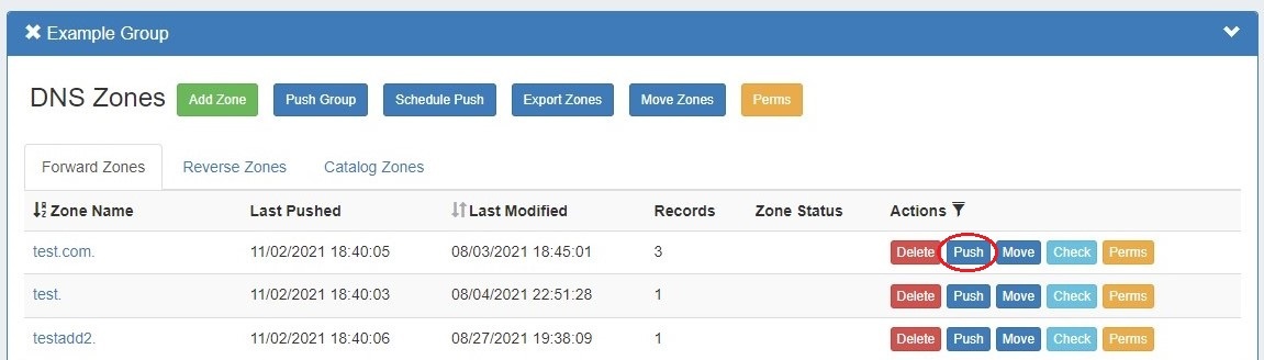 To quickly push just a single zone, go back to the DNS Groups section, and click on the "Push" button for the zone.