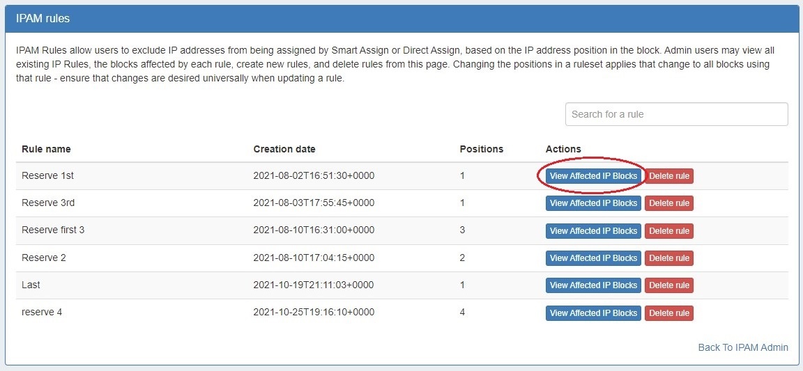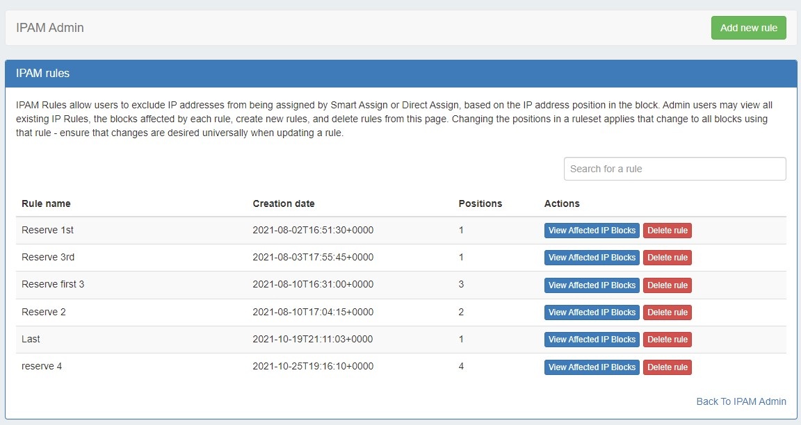 In the IPAM Admin "Edit IPAM Rules" section, Admin users may view all existing IPAM Rules, the blocks affected by each rule, and delete rules.