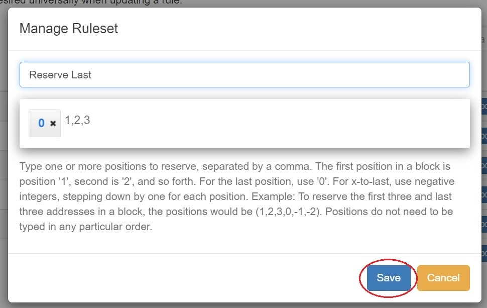 Reserved addresses are set by their position in the block, starting with position '1' to represent the first address, '2' the second, and so on (1,2,3). The last position in the block is represented as '0', with each step backwards set as the next lowest negative integer (0, -1, -2, 3). Rulesets may reserve one or many positions in a block, so you can choose to reserve only the first address (1), only the last address (0), or combinations as desired - reserving the first three and last three addresses on a block would look like (1,2,3,0,1,-2).