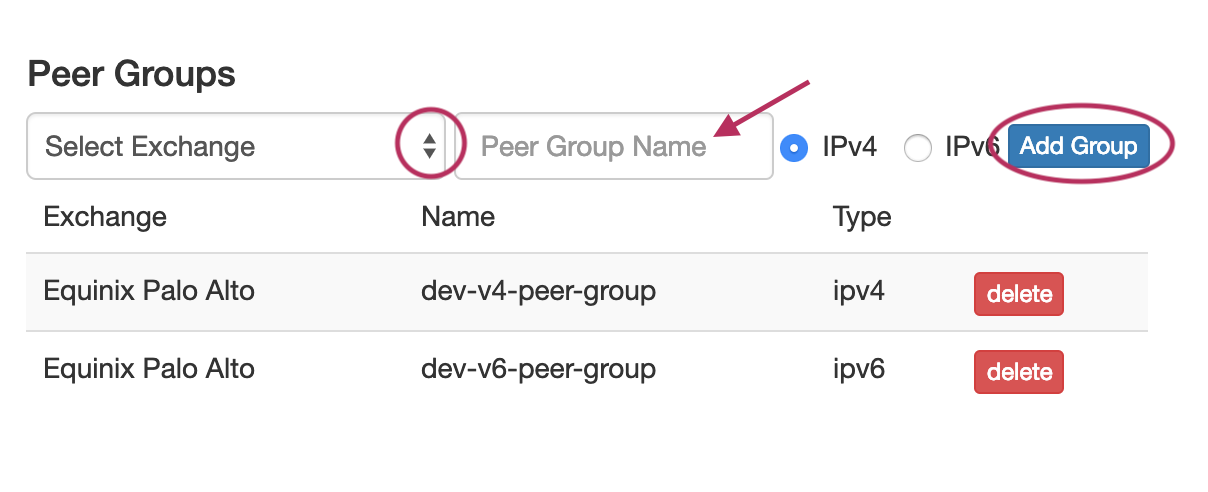 To do this, simply select the exchange, type in a Peer Group name in the text box, select IPv4 or IPv6, the click "Add Group".