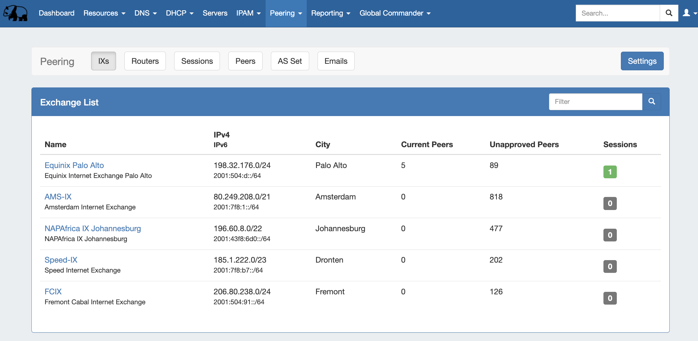 The IXs tab shows the exchange list. From here, you can edit exchange settings and view, manage, and mark peer status and communications via the exchange details page.
