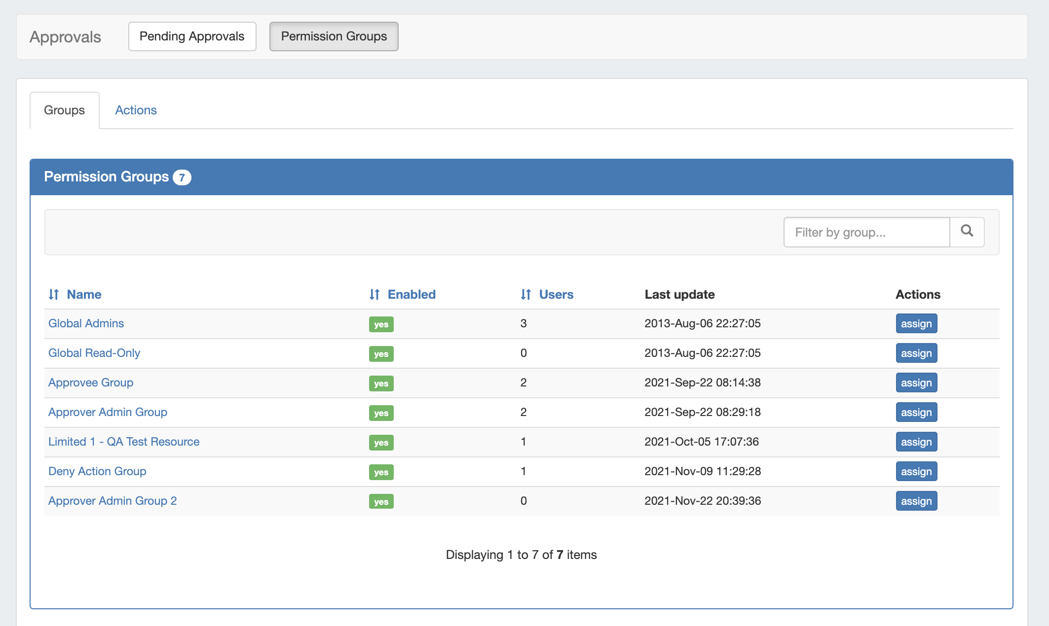 There are two tabs available under Permission Groups - Groups and Actions. Both tabs provide similar levels of functionality to view and assign policies, but they differ in organization.