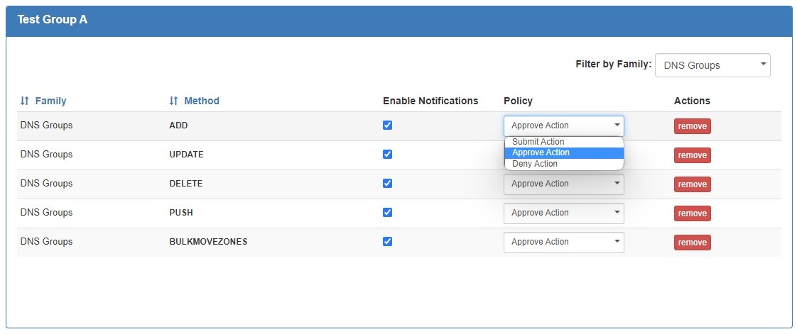 - Approve Action: A User in the group must approve or deny change requests submitted for the selected Family / Action(s), for any Group requiring "Submit Action" for the same action(s) in order for the change to execute. If multiple groups are set as "Approve Action" for the same type of change, then the change will be held as "Pending" or "Pending by Others" until a user from each group approves the change request.