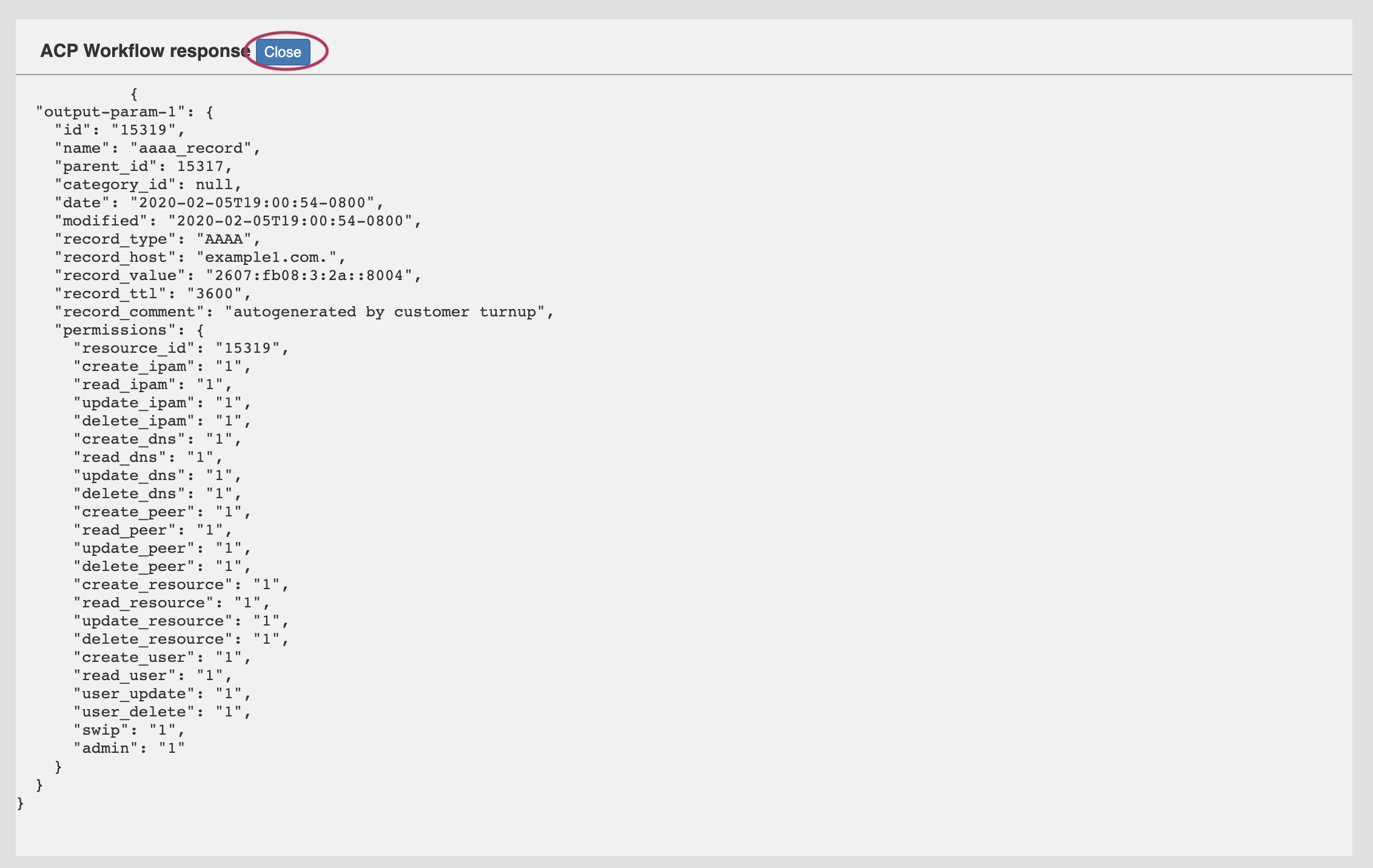 If "Display JSON Results" has been enabled, a display modal will appear showing the JSON response of the executed workflow.