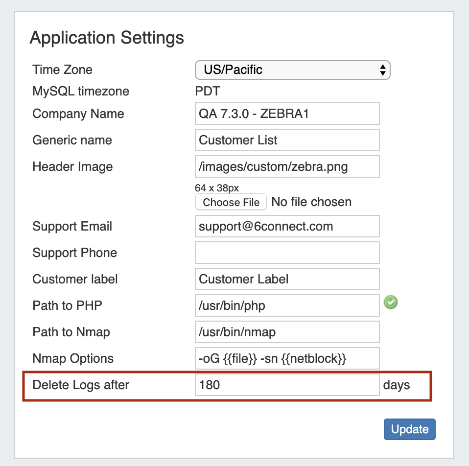 The Admin Preferences page now contains an option under Application Settings to "Delete Logs after X days". By default, this field is set to 180 days.