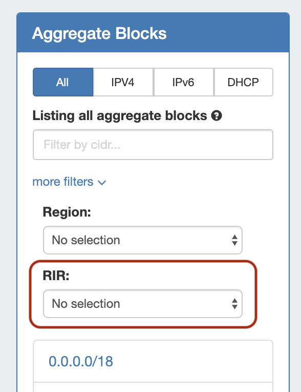 While in the Quickview panel, you may easily search for a block by typing the all or part of the CIDR into the IPv4 or IPv6 Filter boxes - useful for verifying an assignment or quickly scanning ranges.