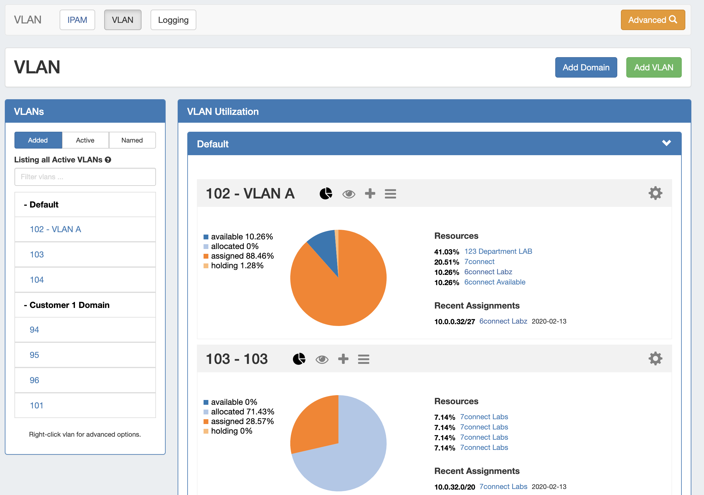 The Utilization panel displays breakdowns for all blocks assigned to the VLAN by both status (available, allocated, assigned, holding) and by resource. Recently assigned blocks are noted under the "Recent Assignments" section, and links are provided to the Resource Entry page for each resource listed. To open or close the Utilization panel, click on the "Pie" icon in the grey header bar.